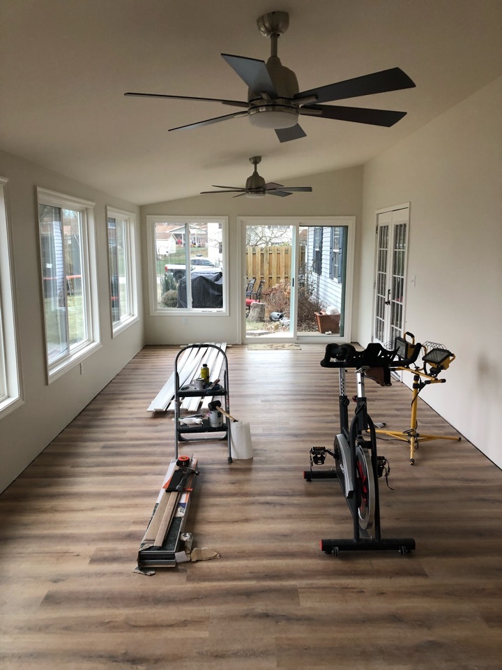 What We Did: We demoed the existing deck in less than 3 days. We then dug holes, set posts, framed the sunroom, framed the deck, ran decking, and insulated the sunroom, installed aluminum rails, installed windows and siding, put up drywall, painted, ran trim, and electric.